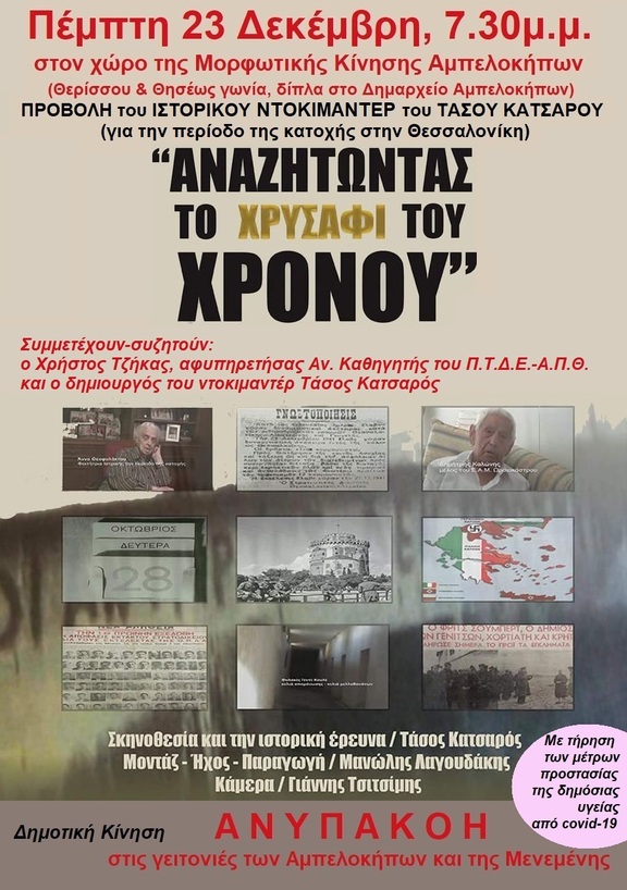 την Πέμπτη 23 Δεκέμβρη, στις 7.30μ.μ., στο χώρο της Μορφωτικής Κίνησης Αμπελοκήπων (Θερίσου και Θησέως γωνία, δίπλα στο Δημαρχείο Αμπελοκήπων).