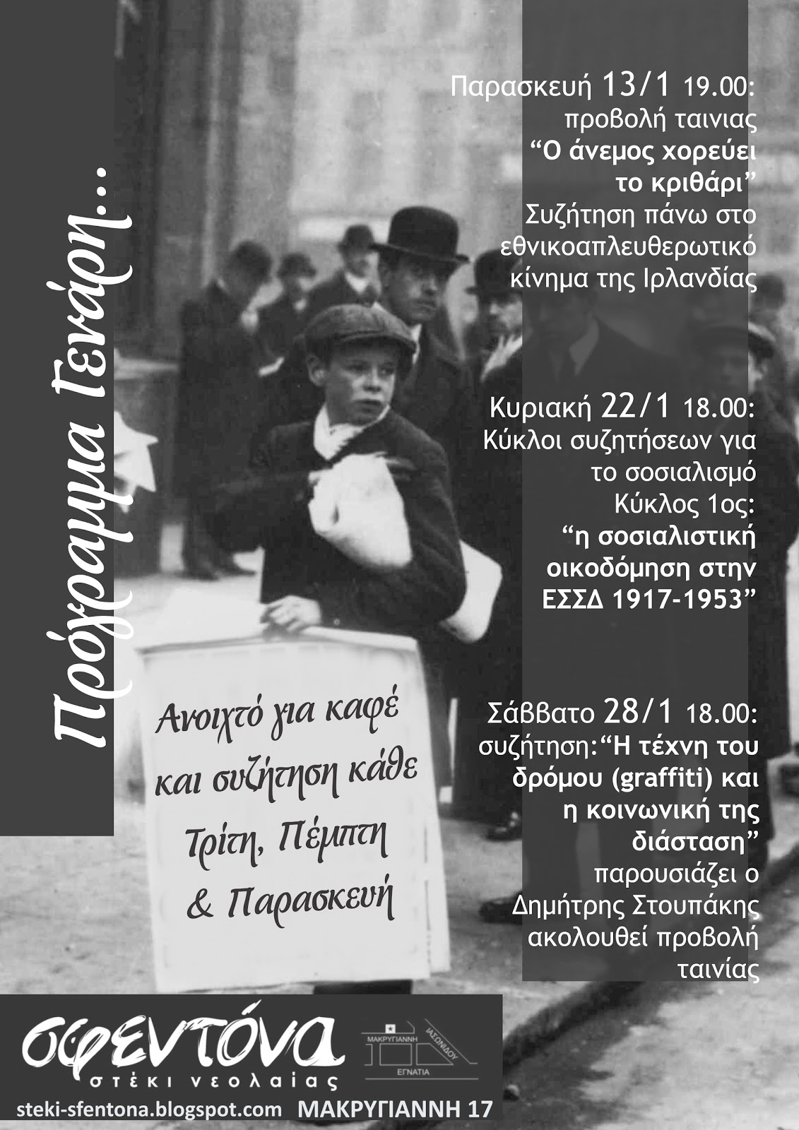 'Επειτα στις 22/1 θα έχουμε τον 1ο κύκλο συζητήσεων για τον σοσιαλισμό,με θέμα την σοσιαλιστική οικοδόμηση στη ΕΣΣΔ απο το 1917 εως και το 1953.