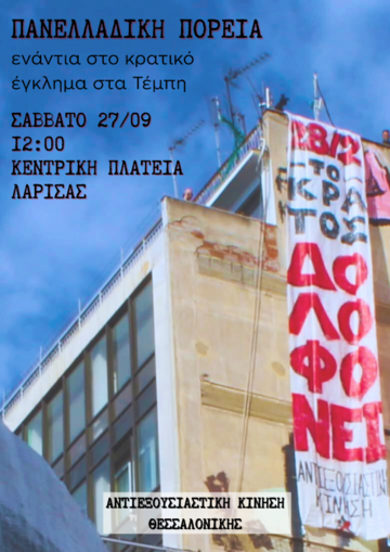 Κάλεσμα στην πορεία ενάντια στην κρατική-καπιταλιστική δολοφονία στα Τέμπη | Σάββατο 27 Σεπτεμβρίου | 12 | Κεντρική Πλατεία Λάρισας