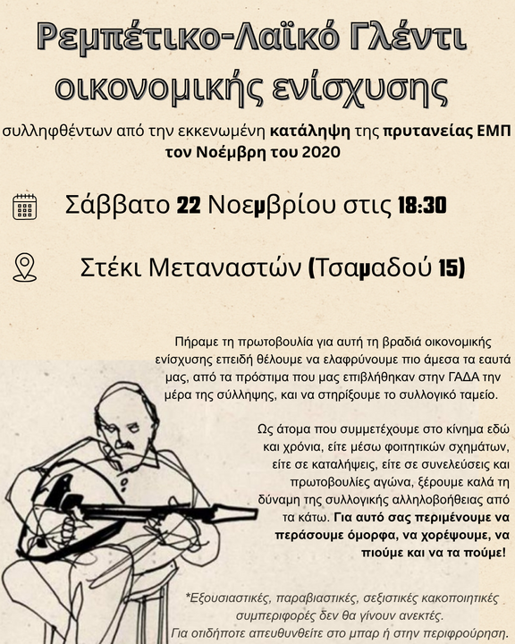 Σας περιμένουμε όλα σε μια βραδιά με ρεμπέτικη/λαϊκή μουσική για την οικονομική ενίσχυση δύο εκ των συλληφθέντων από την εκκενωμένη κατάληψη της πρυτανείας του ΕΜΠ τον Νοέμβρη του 2020.