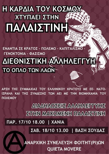 Απέναντι στη δυτική και εγχώρια, σιωνιστική προπαγάνδα των καθεστωτικών ΜΜΕ, την κρατική τρομοκρατία και την αστυνομικόδικαστική καταστολή διεθνιστ(ρι)ών αλληλέγγυων αγωνισ(τρ)ιών, από την αθηναϊκή μητρόπολη μέχρι τα Χανιά, όλη την Κρήτη και τη χώρα, ενώνουμε στο δρόμο τις φωνές και τα βήματα μας μ' εκείνα των λαών σ' όλο τον κόσμο.