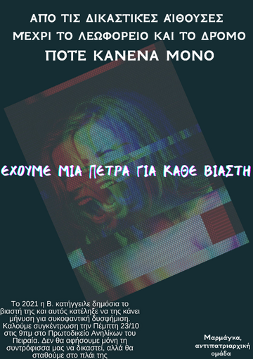 Το 2021 η Β. κατήγγειλε δημόσια τοτον βιαστή της και αυτός κατέληξε να της κάνει μήνυση για συκοφαντική δυσφήμιση. Την Πέμπτη 23/10 στις 9πμ στο Πρωτοδικείο Ανηλίκων του Πειραία, δεν θα αφήσουμε μόνη της τη συντρόφισσά μας να δικαστεί, αλλά θα σταθούμε στο πλάι της.