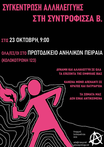 Συγκέντρωση Αλληλεγγύης στη Συντρόφισσα Β. την Πέμπτη 23 Οκτώβρη, στις 9:00πμ στο Πρωτοδικείο Ανηλίκων Πειραιά (Κολοκοτρώνη 123).