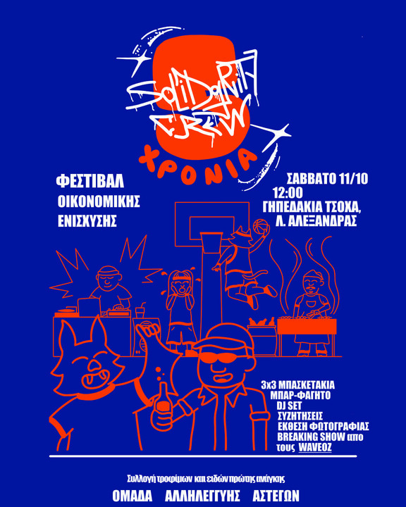 Μπάσκετακια 3χ3, έκθεση φωτογραφίας, ομιλίες & συζήτηση με άλλες συλλογικές κουζίνες, breaking show από τους Waveoz, φαγητό, μπαρ και Dj set περιλαμβάνει η γιορτή που θα στήσουμε! Στο χώρο θα γίνεται επίσης συλλογή τροφίμων και ειδών πρώτης ανάγκης για τις ανάγκες της ομάδας.