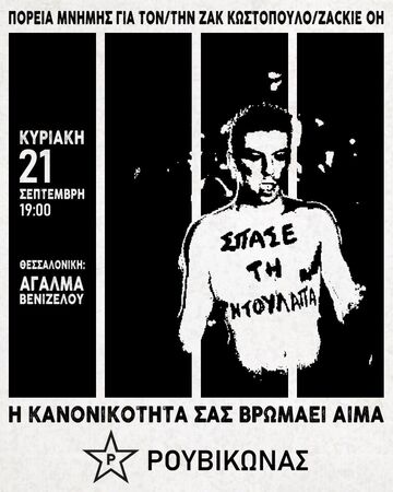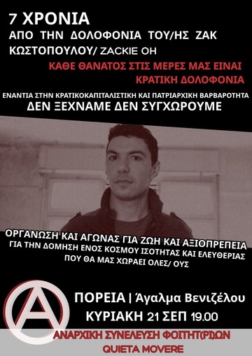 Δεν ξεχνάμε, ούτε συγχωρούμε λοιπόν. Διατηρούμε στη συλλογική μας μνήμη τον Ζακ/τη Zackie, καθώς και όλα τα θύματα του κρατικού-καπιταλιστικού-πατριαρχικού συστήματος και συνεχίζουμε να αγωνιζόμαστε για μια πιο ελεύθερη και αξιοπρεπή ζωή. Ξέρουμε ότι η δικαιοσύνη για τους ανθρώπους της τάξης μας δεν θα έρθει από ένα σύστημα που δολοφονεί και ύστερα συγκαλύπτει τα "παιδιά" του· η μόνη αληθινή δικαιοσύνη μπορεί να έρθει από την καταστροφή αυτού του κόσμου της βίας και της εκμετάλλευσης. Έτσι απέναντι στις πολιτικές του κράτους που περιθωριοποιούν και εξοντώνουν, απέναντι στους στρατούς καταστολής του και τους φασίστες, απέναντι σε κάθε μορφή εξουσίας, προτάσσουμε την οργάνωση και τους κοινούς αγώνες των καταπιεσμένων ενάντια στους καταπιεστές τους. Χτίζουμε κοινότητες με βάση την ελευθερία και την ισότητα· υφαίνουμε δεσμούς αυτοοργάνωσης και αλληλεγγύης.