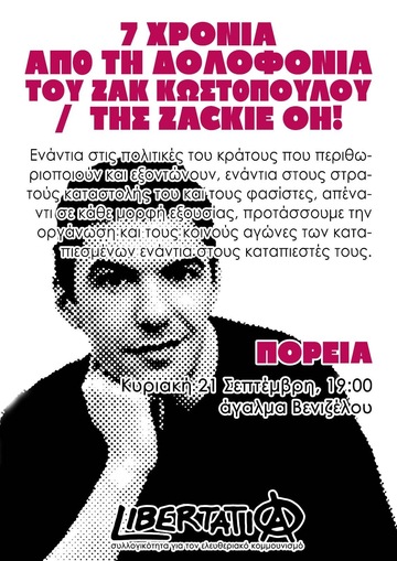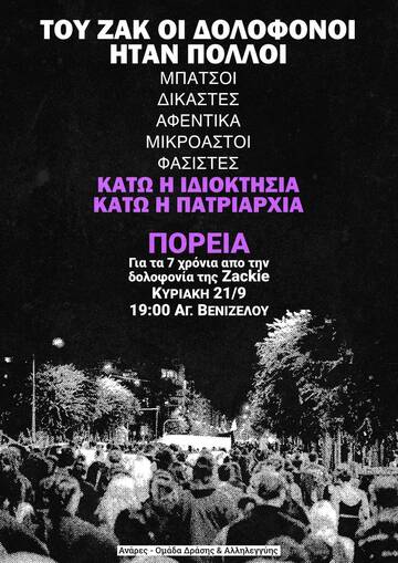 Έχουν περάσει 7 χρόνια από τη δολοφονία του Ζακ ή καλύτερα από το λιντσάρισμά μέχρι θανάτου του στην Ομόνοια. Δύο νοικοκυραίοι καταστηματάρχες, που φέραν βαρέως το αίσθημα της ιδιοκτησίας ξυλοκόπησαν την Zackie που βρισκόταν σε κατάσταση πανικού, πάντα φυσικά, με τη συμβολή των φερέφωνων του κράτους, τους μπάτσους αφήνοντάς την σε ημιθανή κατάσταση στο κέντρο της Αθήνας. Ο άγριος ξυλοδαρμός και η βίαιη προσαγωγή της Zackie διαδραματίστηκε μπροστά στα μάτια φιλήσυχων πολιτών, που μάλλον η συνήθεια στη σιωπή και στην απραγία τους έκανε συνένοχους, βάζοντας κι αυτοί με τη σειρά τους το λιθαράκι τους στο ψηφιδωτό της σιωπής και της σήψης.