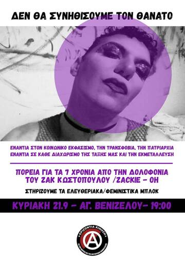 7 χρόνια πριν, στις 21 Σεπτέμβρη 2018, μέρα μεσημέρι στο κέντρο της Αθήνας, ο Ζακ Κωστόπουλος/ η Zackie Oh! δολοφονήθηκε εν ψυχρώ σε ένα άδειο κοσμηματοπωλείο που 'χε καταφύγει ζητώντας "βοήθεια" και εν συνεχεία εγκλωβίστηκε, από τον Ευάγγελο Δημόπουλο, τον ιδιοκτήτη του κοσμηματοπωλείου και τον φασίστα κτηματομεσίτη Αθανάσιο Χορταριά, μπροστά στα αδιάφορα βλέμματα περαστικών. Οι δυό τους τον χτυπούσαν με μανία στο κεφάλι, ενώ οι μπάτσοι που έφτασαν στο σημείο συνέχισαν το δολοφονικό έργο τους, χτυπώντας τον ανήμπορο και αιμόφυρτο και στη συνέχεια τον συνέλαβαν. Στο νοσοκομείο μεταφέρεται ήδη νεκρός.