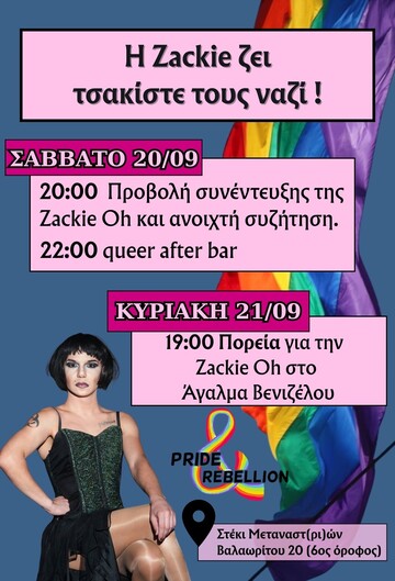 Επτά χρόνια μετά την άγρια δολοφονία, τα περιστατικά βίας πληθαίνουν εις βάρος μας -βία κρατική και μη εναντίον κάθε διαφορετικής ταυτότητας, κάθε έκφρασης και κάθε φωνής που δεν εντάσσεται στα πατριαρχικά, ετεροκανονικά πρότυπα. Η κατάσταση αυτή διαμορφώνει μια νοοτροπία πειθήνιας, άβουλης και -ακόμη καλύτερα- παθητικά μη αντιδραστικής κοινωνίας. Η ευθύνη για την άμβλυνση αυτής της κατάστασης πέφτει σε όλα μας. Η ευθύνη να αποσιωπήσουμε τις μακιαβελικές (ο σκοπός αγιάζει τα μεσα) πολιτικές του νεοφιλελευθερισμού για την εγκαθίδρυση της κοινωνικής συνοχής. Με τον αγώνα και την ύπαρξη μας προκαλούμε την κυριαρχία του συστήματος! Δε θα αφήσουμε ποτέ την φωνή της Zackie να χαθεί!