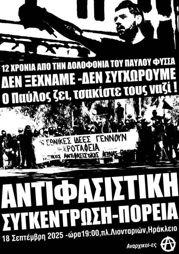 Το ΚΚΕ(μ-λ) καλεί το λαό και τη νεολαία του Ηρακλείου να δώσουν και φέτος μαζικά το παρών, και να διαδηλώσουν ενόψει της επετείου της δολοφονίας του Παύλου Φύσσα από τους φασίστες της Χρυσής Αυγής, την Πέμπτη 18/9, ώρα 19:00 Λιοντάρια.