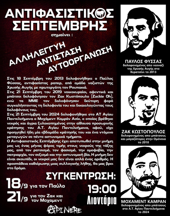 Ο Σεπτέμβρης είναι εδώ για να μη μας αφήνει να ξεχνάμε τους/τις/τα δολοφονημένους/δολοφονημένες/δολοφονημένα της τάξης μας και να μας θυμίζει πως οι αντιφασισιστικοί, αντιπατριαρχικοί και αντιρατσιστικοί αγώνες είναι πάντα επιβεβλημένοι. Είτε η δολοφονία έγινε από φασίστες, είτε από νοικοκυραίους, είτε από το ίδιο το κράτος, για εμάς και οι τρεις είναι πρόσωπα του ίδιου ανθρωποφάγου συστήματος.