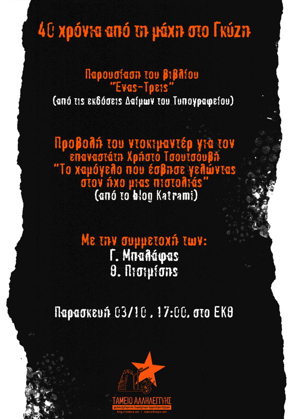 - Προβολή του ντοκιμαντέρ για τον επαναστάτη Χρήστο Τσουτσουβή "Το χαμόγελο που έσβησε γελώντας στον ήχο μιας πιστολιάς" (από το blog Katrami)