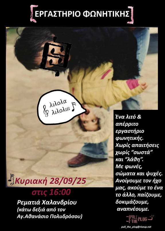 Την Κυριακή 28 Σεπτεμβρίου μαζευόμαστε στην ρεματιά Χαλανδρίου (στο σημείο κάτω δεξιά άπο τον Άγιο Αθανάσιο Πολυδρόσου) για ένα εργαστήριο φωνητικής.