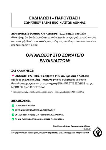 📍 OPEN ASSEMBLY: On Saturday, October 11, at 17.00 at the theatre of Akadimia Platonos to discuss our rights and the strategy AGAINST EVICTIONS and for RENT REDUCTIONS NOW!