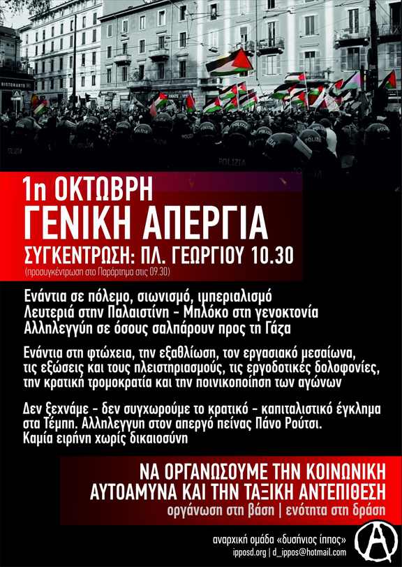 Ενάντια στη φτώχεια, την εξαθλίωση, τον εργασιακό μεσαίωνα, τις εξώσεις και τους πλειστηριασμούς, τις εργοδοτικές δολοφονίες, την κρατική τρομοκρατία και την ποινικοποίηση των αγώνων.