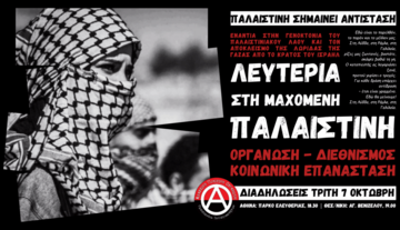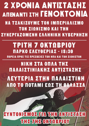 Στις 7 Οκτωβρίου 2025 συμπληρώνονται 2 χρόνια από την επιχείρηση Αλ-Ακσα της Παλαιστινιακής Αντίστασης. Τα γεγονότα της 7 Οκτωβρίου και η γενοκτονία στην Παλαιστίνη δεν αποτελούν φυσικά την έναρξη της ιστορίας αλλά ένα σημείο καμπής στην κλιμάκωση της κρατικής και ιμπεριαλιστικής βαρβαρότητας του Ισραηλινού Κράτους και των συμμάχων του (ΗΠΑ, ΝΑΤΟ). Το Ελληνικό Κράτος συμμετέχει ενεργά στην γενοκτονία, μέσω των Νατοϊκών Βάσεων (Σούδα), την αποστολή πολεμικού υλικού στο Ισραήλ, την επικοινωνιακή προπαγάνδα και την καταστολή του κινήματος αλληλεγγύης, εμπλέκοντας την ελλαδική κοινωνία όλο και περισσότερο στον εν ενεργεία Τρίτο Παγκόσμιο Πόλεμο.