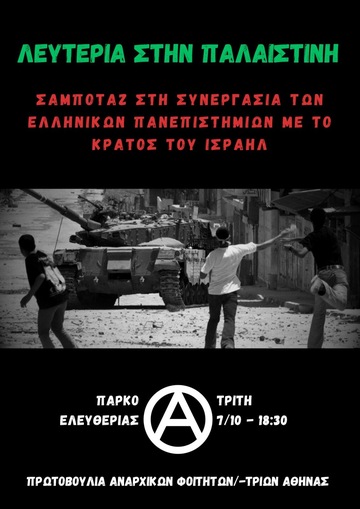 Στην Παλαιστίνη συμπυκνώνεται αυτή τη στιγμή όλη η βιαιότητα των κρατών, της εξουσίας, του καπιταλισμού. Απέναντι στον κόσμο της εξουσίας σε κάθε γωνιά του πλανήτη, να πραγματοποιηθούν σαμποτάζ ενάντια στο κράτος του Ισραήλ που διεξάγει γενοκτονία, σε κάθε σχολή, σε κάθε λιμάνι που φεύγουν πολεμοφόδια, σε κάθε κτίριο και εταιρεία της πολεμικής βιομηχανίας, να πραγματοποιηθούν αρνήσεις στράτευσης και η επίθεση να είναι συνολική. Η αλληλεγγύη στις/ους από τα κάτω στην Παλαιστίνη και σε όσα αυτή τη στιγμή δολοφονούνται στη Μέση Ανατολή είναι κομβικής σημασίας, ώστε να δυναμώσει ο αγώνας σε κάθε πεδίο. Ο μανδύας που ενδύεται το Ισραηλινό κράτος, αυτός δηλαδή ενός 'δυτικού σύγχρονου προοδευτικού φεμινιστικού κράτους' δεν μπορεί να κρύψει τη γενοκτονία που διεξάγεται. Τα καλέσματα για πόλεμο ενάντια στην 'τρομοκρατία' που αποστέλλει προς πάσα κατεύθυνση, δεν είναι παρά μια ρητορική αποπροσανατολισμού. Οι από τα κάτω της Παλαιστίνης δολοφονούνται στους δρόμους, στα σπίτια, εκτοπίζονται από τόπο σε τόπο γιατί ανήκουν σε μια συγκεκριμένη πολιτισμική πληθυσμιακή ομάδα και γιατί ζουν σε αυτά τα εδάφη. Η συνεχής αντίστασή τους όλες αυτές τις δεκαετίες, θα συντροφεύει κάθε άνθρωπο που αγωνίζεται για ζωή και ελευθερία. Αδιαπραγμάτευτα στο πλευρό των Παλαιστίνιων. Με όπλο την αλληλεγγύη να δυναμώσουν οι αγώνες και να απλωθούν σε όλον το πλανήτη, για ένα αντιπολεμικό αντιεξουσιαστικό κίνημα που θα έρθει σε σύγκρουση με τα αφεντικά και κάθε μορφή εκμετάλλευσης και καταπίεσης. Για τον αγώνα για την κοινωνική επανάσταση, για την ολική ανατροπή του υπάρχοντος και τον ερχομό μιας αναρχικής ζωής και κοινωνίας. Μέχρι ο σημερινός κόσμος να αποτελεί μια θύμηση του γιατί αγωνιστήκαμε όλα μαζί πλάι πλάι, για αυτούς που χάσαμε σε αυτόν τον αγώνα και για όλες αυτές που δεν ξεχάσαμε αλλά πορευθήκαμε μαζί, αλλά και για αυτές.