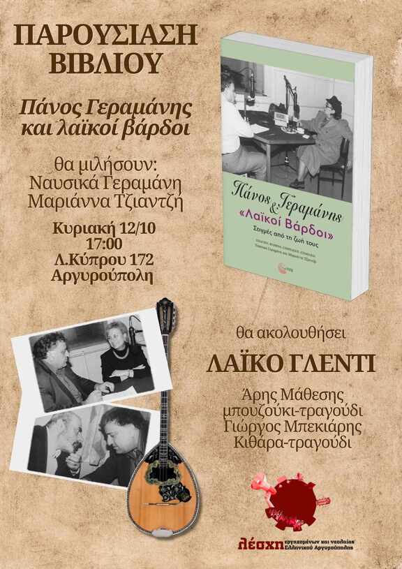 Θα παρουσιάσουμε το βιβλίο «Πάνος Γεραμάνης και Λαϊκοί Βάρδοι» που επιμελήθηκαν η δημοσιογράφος Μαριάννα Τζιαντζή και η σύντροφος στη ζωή του Πάνου Γεραμάνη, Ναυσικά.
