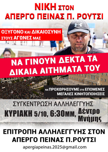 - Με διαδηλώσεις, απεργίες, αγώνα διαρκείας: Να μην είμαστε θεατές στο έγκλημα - Να συμμετέχουμε ενεργά ΜΕ ΔΡΑΣΕΙΣ στη δίκαιη υπόθεση του Π. Ρούτσι!