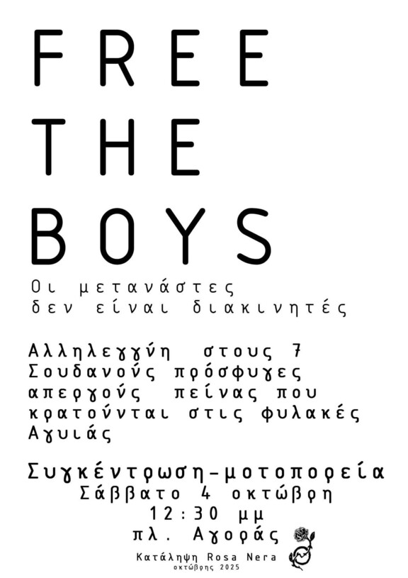 Στεκόμαστε αλληλέγγυες/οι στον αγώνα των επτά Σουδανών. Η έλλειψη προσωπικού που προφασίζεται η διεύθυνση, καθώς και η στημένη κατηγορία περί διακίνησης, δεν μας πείθουν. Απαιτούμε τώρα την μεταφορά τους και την παροχή ειδών πρώτης ανάγκης και συνεχίζουμε να αγωνιζόμαστε για την τελική απελευθέρωση τους.