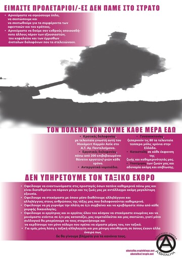 Για εμάς ο πόλεμος θίγει και πατάει πάνω στα κατώτερα στρώματα της κοινωνίας και που μόνο τα δικά μας συμφέροντα δεν έχει κατά νου. Οφείλουμε να τονίζουμε προς κάθε εξουσία πως δεν είμαστε αναλώσιμοι και δεν έχουμε καμία σκέψη να πολεμήσουμε για τα συμφέροντα και τα κέρδη τους. Μόνος πόλεμος που είναι για μας ηθικός είναι αυτός μέσα από τον οποίο θα διεκδικήσουμε καλύτερους όρους ζωής μακριά από τα σχέδιά τους, ο ταξικός.