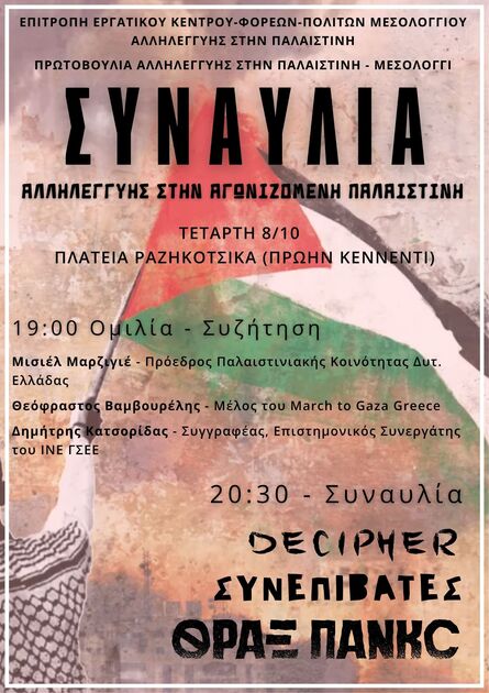 Διοργάνωση: Επιτροπή Εργατικού Κέντρου - Φορέων- Πολιτών Μεσολογγίου Αλληλεγγύης στην Παλαιστίνη