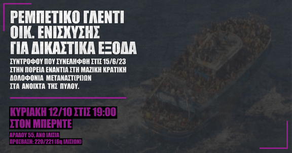 Την Κυριακή 12/10 από τις 19:00 (λήξη 24:00) θα πραγματοποιηθεί ρεμπέτικο γλέντι στον Μπερντέ για τα δικαστικά έξοδα συντρόφου που συνελήφθη στις 15/6/23 στην πορεία ενάντια στην κρατική δολοφονία μεταναστ(ρι)ων στα ανοιχτά της Πύλου.