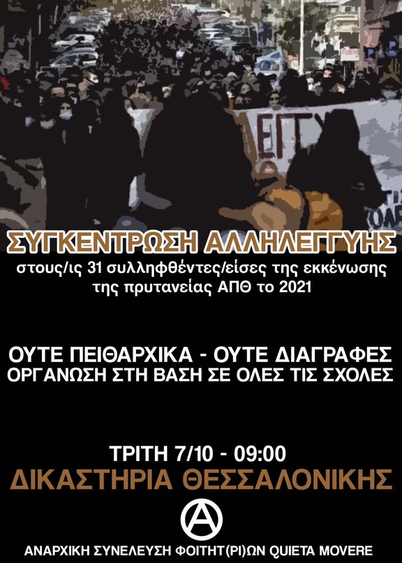 Συγκέντρωση αλληλεγγύης στους/ις 31 συλληφθέντες/είσες της εκκένωσης της κατειλημμένης Πρυτανείας ΑΠΘ στις 22 Φλεβάρη 2021
