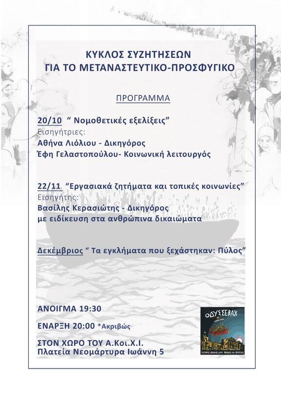 Τη Δευτέρα 20 Οκτωβρίου 2025, ώρα 7.30μ.μ., στον Α.Κοι.Χ.Ι., θα συζητήσουμε τις νομοθετικές εξελίξεις σχετικά με το μεταναστευτικό και το προσφυγικό ζήτημα.