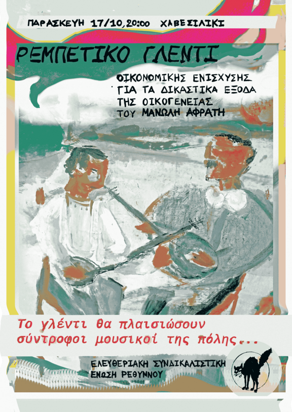 Εν όψει του εφετείου που θα πραγματοποιηθεί την Τρίτη 11 Νοέμβρη στο Εφετείο Χανίων, σας καλούμε να στηρίξετε με την παρουσία σας, σε ένα αξέχαστο γλέντι που θα πραγματοποιηθεί την Παρασκευή 17/10 και ώρα 20.00, στο Χαβεσιλίκι, Μουσούρου 14.
