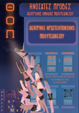 Η Θεατρική Ομάδα Πολυτεχνείου ανοίγει ξανά́ τις πόρτες της σε όλες τις ατομικότητες που ενδιαφέρονται να έρθουν σε επαφή́ με το θέατρο, την σκηνή́ και το σώμα τους!