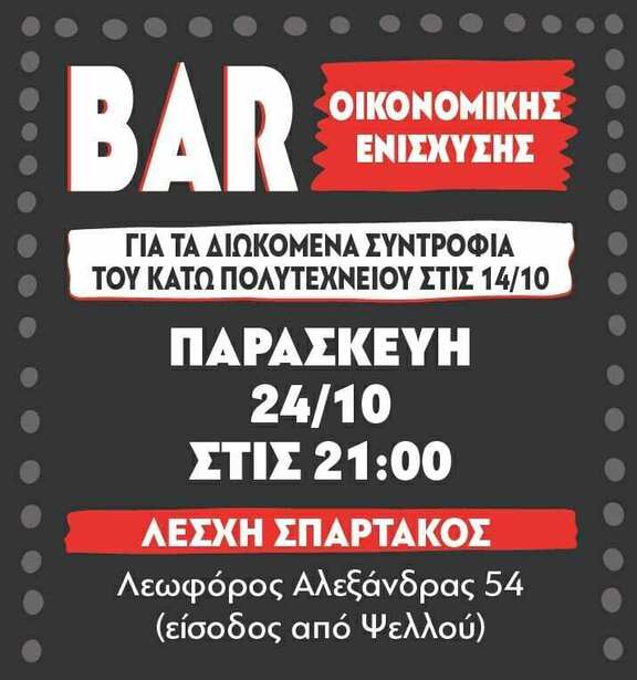 Την ερχόμενη Παρασκευή στη Λέσχη Σπάρτακος, μαζευόμαστε, πίνουμε, διασκεδάζουμε και στηρίζουμε τα συντρόφια που δικάζονται μετά την έφοδο της ΕΛΑΣ στο Κάτω Πολυτεχνείο στις 14/10.