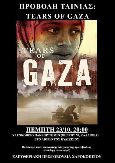 Προβολή Ταινίας "Tears of Gaza", Πέμπτη 23/10 στο αίθριο του κυλικείου* στις 20:00.