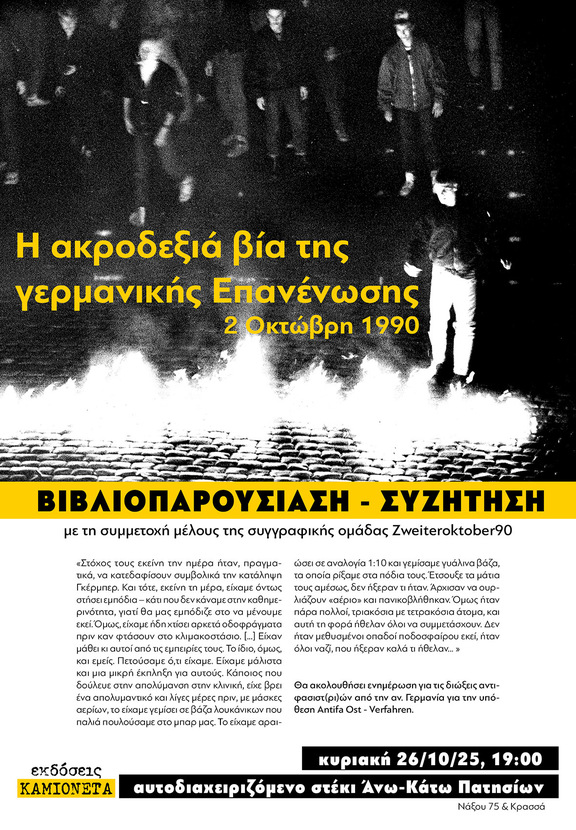 Την Κυριακή 26/10, στις 7 μμ, θα παρουσιαστεί το βιβλίο "Βιβλιοπαρουσίαση: Η ακροδεξικά βία της γερμανικής Επανένωσης - 2 Οκτώβρη 1990" απο τις εκδόσεις Καμιονέτα (Ιωάννινα).