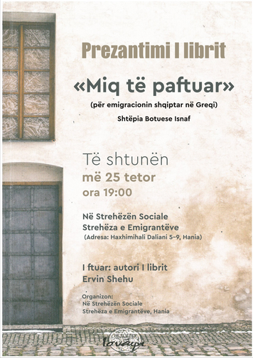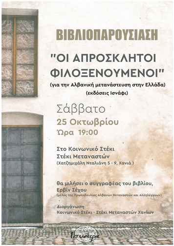 Μεταναστών Χανίων (οδός Χατζημιχάλη Νταλιάνη 5), στις 7 μ.μ., παρουσίαση του βιβλίου: