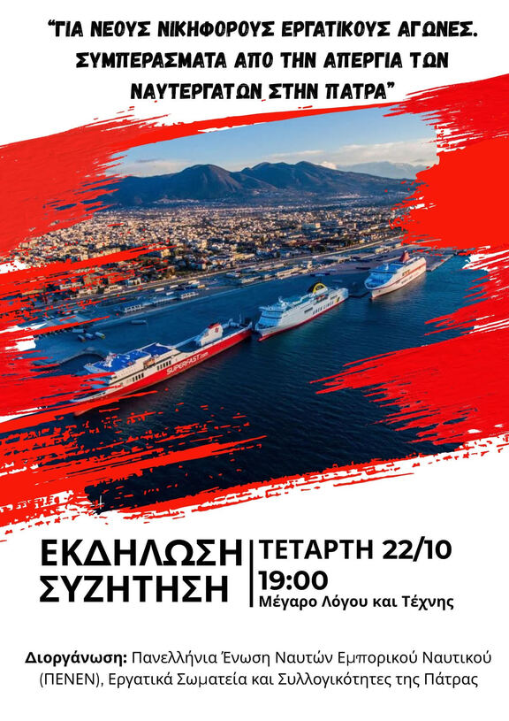 Εκδήλωση Σωματείων και σχημάτων: "Για νέους νικηφόρους εργατικούς αγώνες: Συμπεράσματα από την απεργία των Ναυτεργατών στην Πάτρα" (Τετάρτη 22/10)