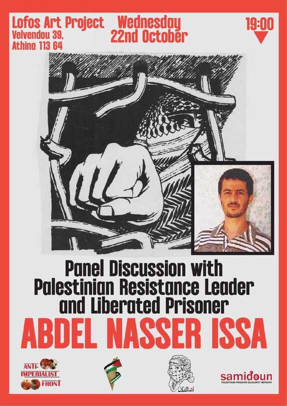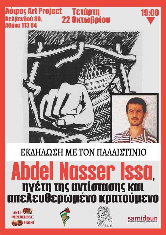 Καλούμε σε εκδήλωση- συζήτηση με τον Abdel Nasser Issa, Παλαιστίνιο ηγέτη και πρώην πολιτικό κρατούμενο, για 30 χρόνια στις φυλακές του Σιωνισμού, για να συζητήσουμε τον εξελισσόμενο ρόλο της Παλαιστινιακής διασποράς και των διεθνών κινημάτων αλληλεγγύης στον αγώνα των Παλαιστινίων για λευτεριά από το ποτάμι ως τη θάλασσα.