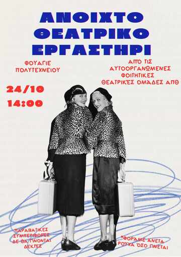 Οι φοιτητικές αυτοοργανωμένες θεατρικές ομάδες του ΑΠΘ διοργανώνουν ένα ανοιχτό θεατρικό εργαστήριο, ως πράξη αντίστασης απέναντι στην πολιτική αποκλεισμού της καλλιτεχνικής δημιουργίας μέσα στους πανεπιστημιακούς χώρους.