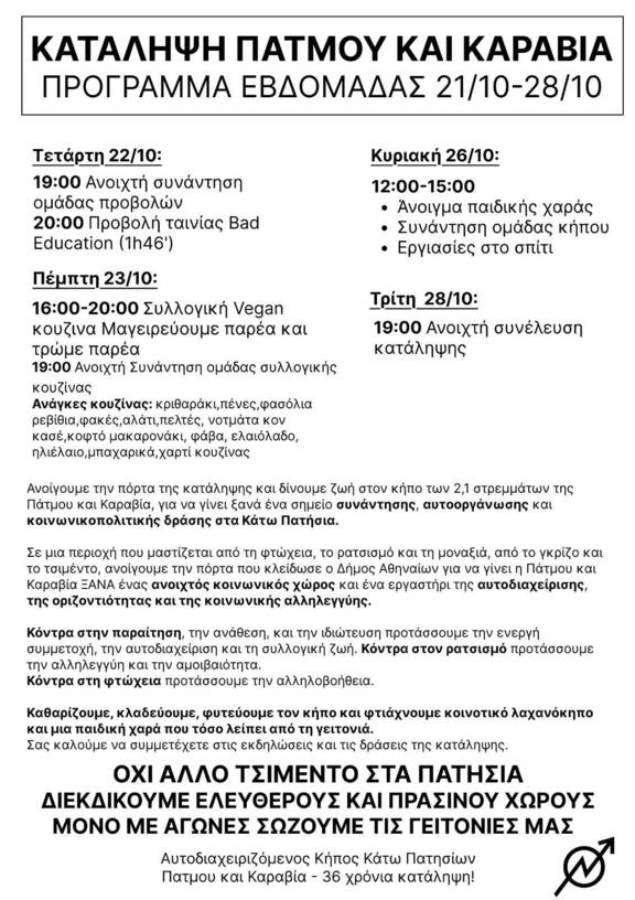 19:00 Ανοιχτή συνέλευση της κατάληψης Πάτμου & Καραβία