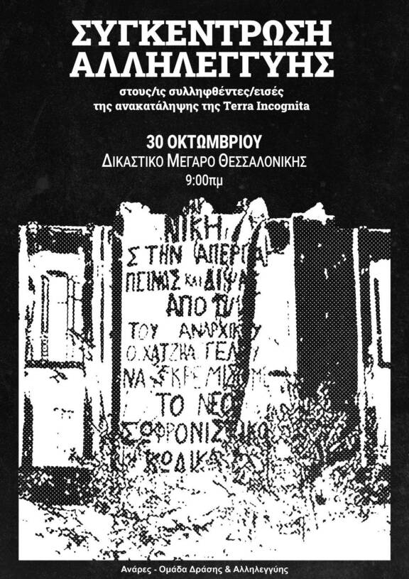 Συγκέντρωση αλληλεγγύης στα συλληφθέντα από την ανακατάληψη της Terra incognita , 30/10 9:00 Δικαστήρια Θεσσαλονίκης