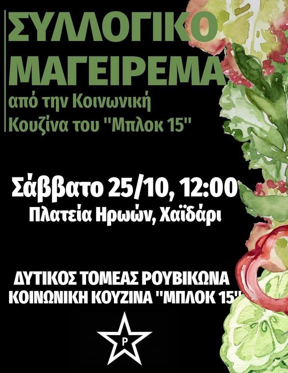 Το Σάββατο 25/10 στις 12:00, στήνουμε καζάνια στην Πλατεία Ηρώων, Χαϊδάρι, μαγειρεύουμε συλλογικά και μοιραζόμαστε φαγητό, κουβέντα και φροντίδα.