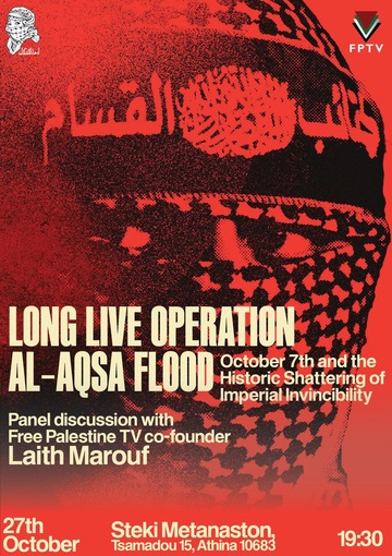 Join us at Steki Metanaston (Tsamadou 15, Athens) on Monday, October 27th for a panel discussion with Laith Marouf (in-person) on the resounding, epoch-defining reverberations of Operation Al Aqsa Flood - a beacon of liberation to the oppressed the world over for its shattering of the Zionist colony's mirage of invincibility.