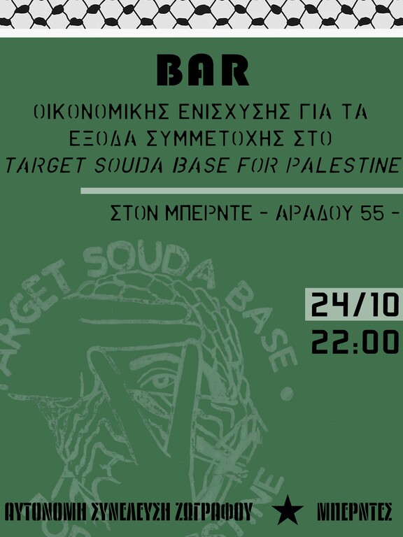 Αυτήν την Παρασκευή 24/10 στις 22.00 (λήξη 2:30) θα πραγματοποιηθεί στον Μπερντέ μπαρ οικονομικής ενίσχυσης από κοινού με την Αυτόνομη Συνέλευση Ζωγράφου για την κάλυψη μέρους των εξόδων συμμετοχής στο διήμερο του Target Souda Base for Palestine που πραγματοποιήθηκε στα Χανια στις 17&18 Οκτωβρίου.