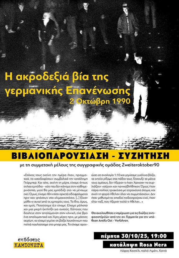 Βιβλιοπαρουσίαση/Συζήτηση : «Η ακροδεξιά βία της γερμανικής Επανένωσης-2 Οκτώβρη 1990» από τις εκδόσεις Καμιονέτα | Ηράκλειο 29/10 ώρα:19:00,στην Κατάληψη Ευαγγελισμού | Χανιά 30/10 ώρα:19:00,στην Κατάληψη Rosa Nera