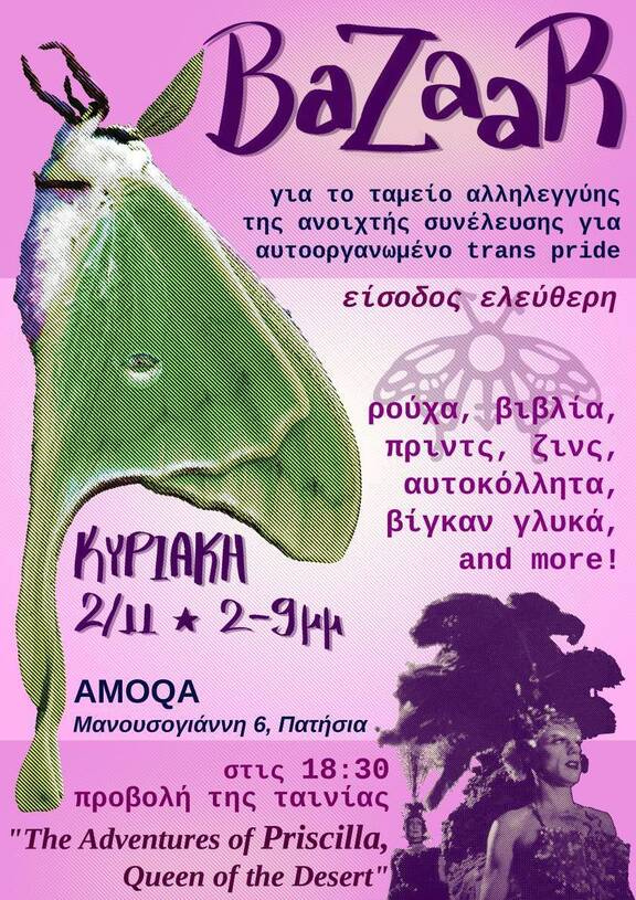 As the Assembly for the self-organized Trans Pride, we're inviting you this Sunday, November 2nd, from 2pm till 9pm, to our Bazaar aimed at supporting our solidarity fund. The event will take place at Amoqa (Manousogianni 6, Agios Nikolaos) and is meant to help cover the needs of our trans comrades. There'll be clothes, books, prints, zines, stickers, vegan treats and drinks. At 6:30 pm, we'll also be screening "The Adventures of Priscilla, Queen of the Desert".