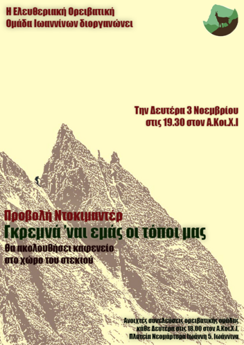Την Δευτέρα 3 Νοεμβρίου και ώρα 19.30 το απόγευμα, ακριβώς μετά την ανοιχτή της συνέλευση, η Ελευθεριακή Ορειβατική Ομάδα Ιωαννίνων σας υποδέχεται στην προβολή του ντοκιμαντέρ Γκρεμνά 'ναι εμάς οι τόποι μας. Θα ακολουθήσει καφενείο με συζήτηση μετά την προβολή στο χώρο του Α.Κοι.Χ.Ι. Σας περιμένουμε!