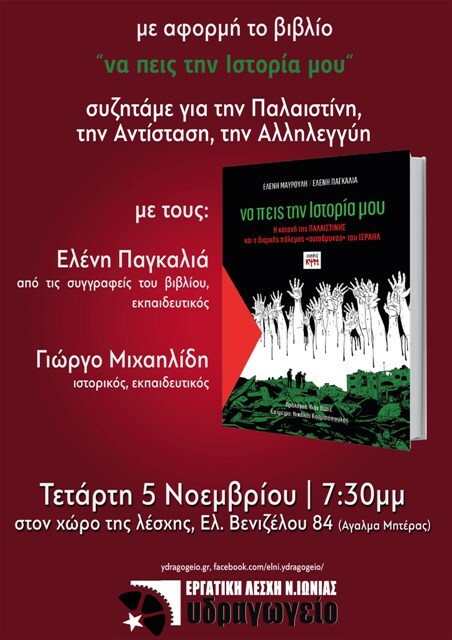 Η Εργατική Λέσχη Νέας Ιωνίας οργανώνει εκδήλωση - συζήτηση με αφορμή το βιβλίο «Να πεις την ιστορία μου» των Ελένης Μαυρούλη και Ελένης Παγκαλιά.