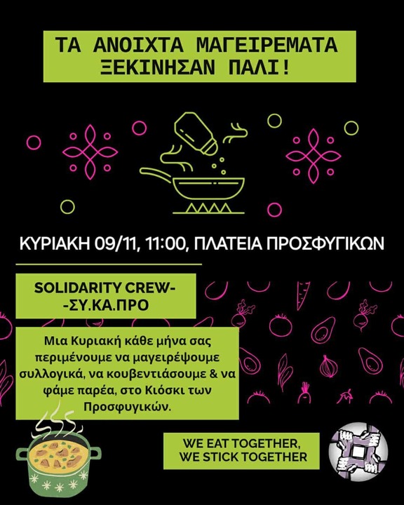 Τα ανοιχτά μαγειρέματα ξεκινούν πάλι! Αυτή την Κυριακή, 09/11, από τις 11 το πρωί θα βρισκόμαστε στην πλατεία των Προσφυγικών για το ανοιχτό μας μαγείρεμα.