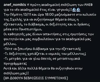 Όλα αυτά όσο στο εσωτερικό του χώρου ανεξάρτητοι φοιτητές (οι γνωστοι-αγνωστοι ΑΝΕΦ) ζητούν την γνώμη των ειδικών για… το πότε να ξεκινήσουν το διάβασμα για την εξεταστική (sic!). Αφού η μόνη δεξιότητα που χρειάζεται για να γίνεις ο "νομικός του μέλλοντος" που ονειρεύονται είναι να είσαι καλός ρουφιάνος και ακόμα καλύτερος πελάτης.