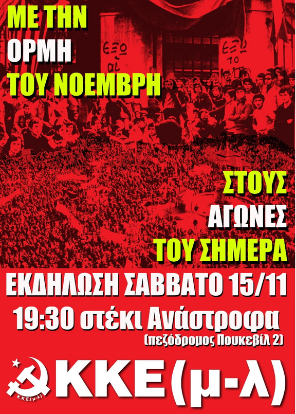 Το ΚΚΕ(μ-λ) καλεί σε συμμετοχή της νεολαίας και του λαού της Πάτρας στις τριήμερες εκδηλώσεις με αφορμή την επέτειο της εξέγερσης του Νοέμβρη που θα κορυφωθούν με την διαδήλωση της Δευτέρας 17/11 στις 6:00μμ από τον ιστορικό χώρο του Παραρτήματος.