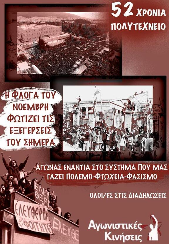 Είναι ξεκάθαρο ότι 52 Νοέμβρηδες μετά , οι αγώνες των τότε φοιτητών και το σύνολο της μαχόμενης κοινωνικής βάσης, είναι ακόμα εδώ, ενώ η καταστολή που βιώνουμε μπορεί να παίρνει διάφορες μορφές ανά τα χρόνια αλλά η ουσία παραμένει η ίδια.
